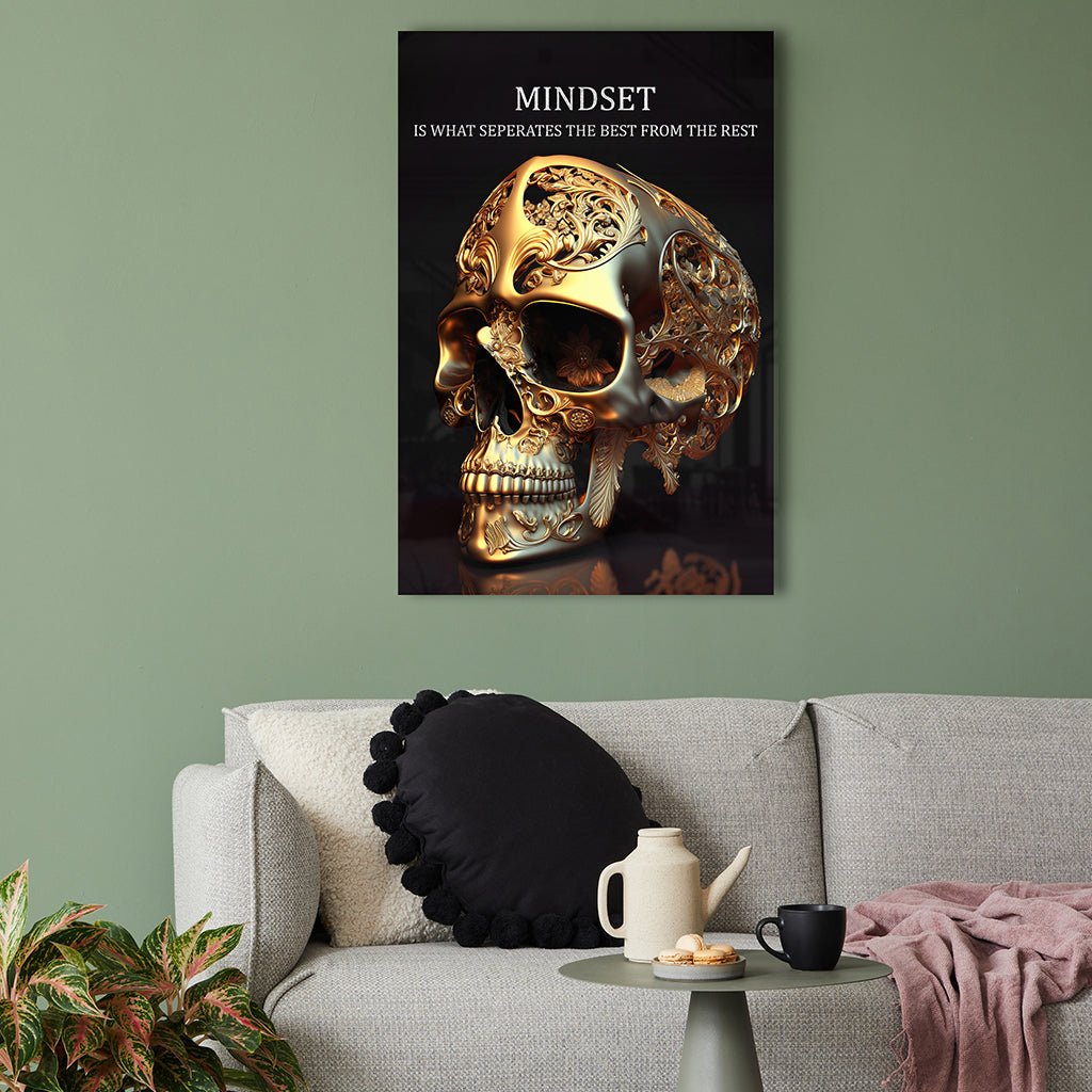 L'image de motivation représente un fascinant crâne doré, orné d'une manière artistique de motifs et d'ornements floraux. Au-dessus, la citation inspirante : « Mindset is what separates the best from the rest » – un rappel de l'importance de l'état d'esprit et de la détermination, rehaussé de feuilles d'argent.