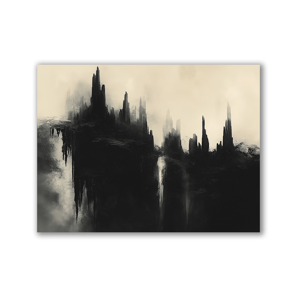 Eine düstere und abstrakte Landschaft, die von schroffen, dunklen Felsformationen dominiert wird, die in den Himmel ragen. Teilweise verhüllt von Nebel oder Dunst. Unterhalb der Felsen fließen dunkle Schlieren und Tropfen herab, die an Wasserfälle erinnern und eine spiegelnde Oberfläche andeuten. Die Farbpalette ist auf Schwarz und Beige beschränkt, was der Szene eine mystische und unheimliche Atmosphäre verleiht.