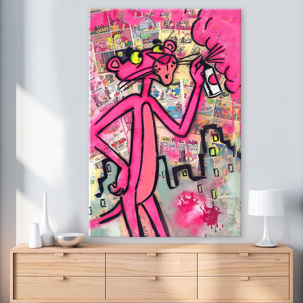 La Panthère rose, dans un style graffiti, se tient devant un fond de vieilles pages de bandes dessinées disposées en un motif coloré et chaotique, et vaporise de la peinture graffiti rose sur le mur de la bande dessinée.