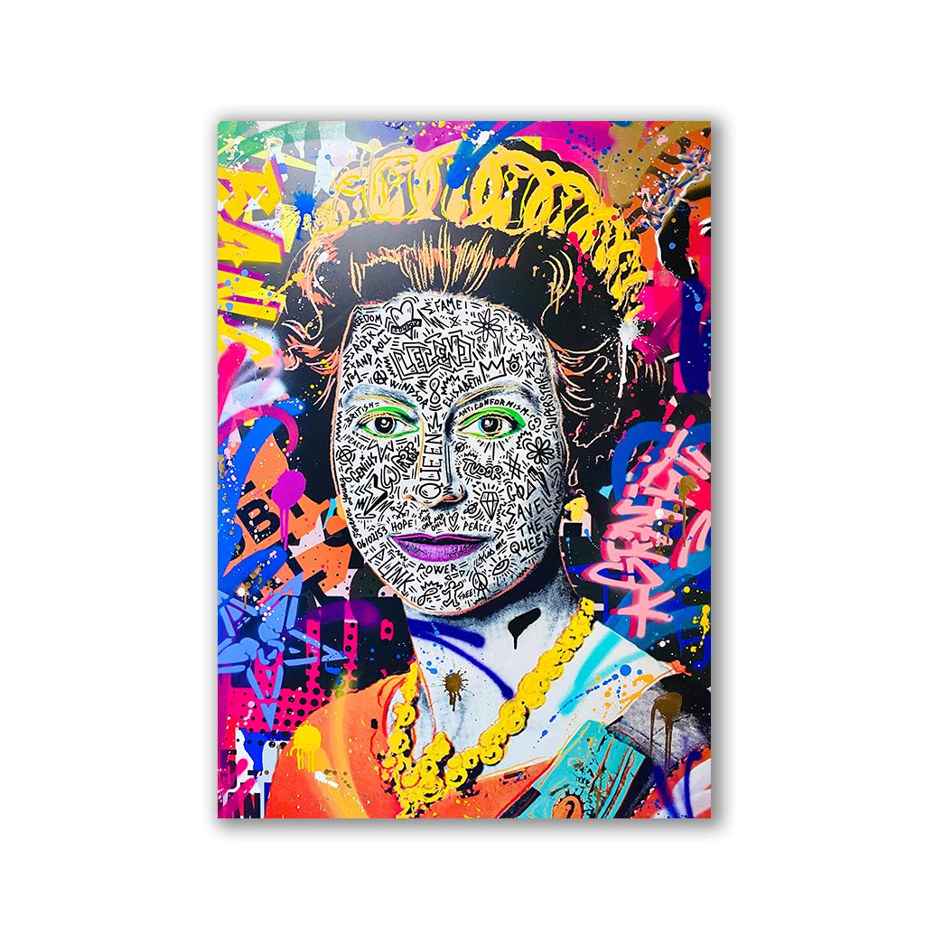 Plongez dans l'histoire avec cette image fascinante de la reine Elizabeth II en noir et blanc, entourée d'un fond artistique et coloré. Le visage de la reine est recouvert d'une multitude de symboles et de mots, formant une énigme pour le spectateur. Cette œuvre d'art est un régal visuel pour tous les amateurs d'art, d'histoire et de culture.