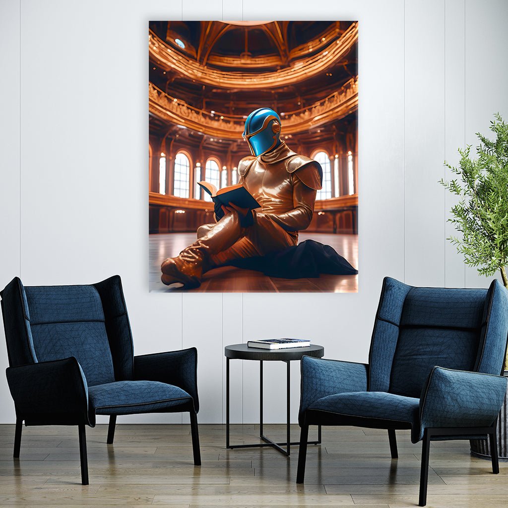 Ein Mann in einem glänzenden goldenen Kostüm und einem auffälligen blauen Helm sitzt auf dem Boden der Theatertribüne und vertieft sich in ein Buch. Die prächtige Architektur des Theaters entfaltet sich im Hintergrund, mit den eleganten Sitzrängen. Die gesamte Farbgestaltung des Bildes ist dominierend in Gold gehalten, wodurch der Mann und sein Kostüm harmonisch in die luxuriöse Atmosphäre des Theaters eingebettet sind.