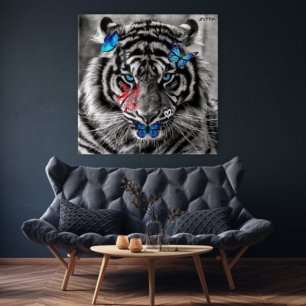 Das eindrucksvolle Schwarz-Weiß-Portrait zeigt einen imposanten Tiger mit eleganten blauen Monarchfaltern auf ihm, die eine anmutige und geheimnisvolle Atmosphäre schaffen. Die Noir-Ästhetik des Porträts fängt die düstere und gleichzeitig faszinierende Welt des Tigers ein, während die blauen Monarchfalter eine subtile symbolische Note hinzufügen.