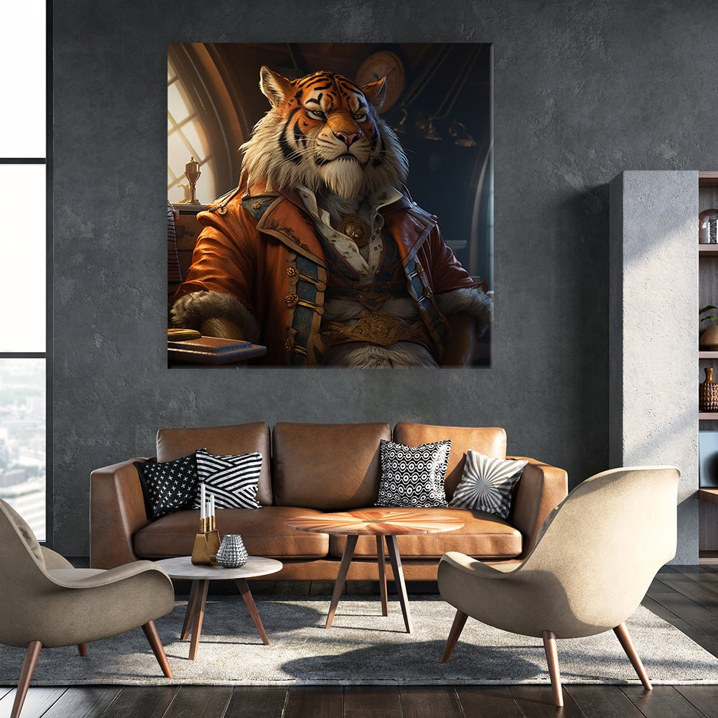 Ein gewaltiger Tiger, stolz und wild, thront auf einem massiven Stuhl, gehüllt in ein Piratenoutfit aus robustem Leder. Sein Blick ist finster, eine Aura von Macht und Entschlossenheit umgibt ihn. Als Pirat der Meere beherrscht er das Reich der Wellen und setzt sein Reich durchdringend in Szene.