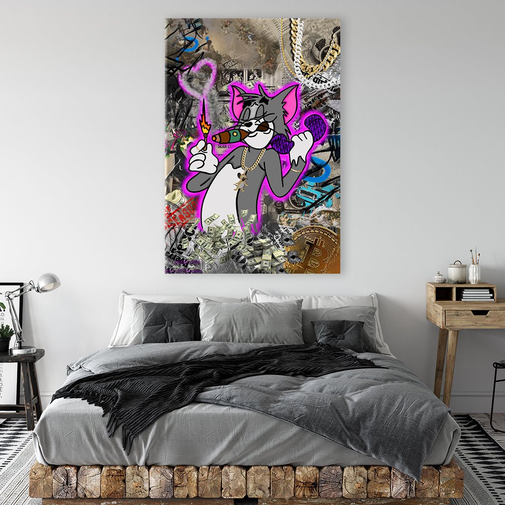 Tom, bekannt aus "Tom und Jerry", zeigt sich hier als tüchtige Businesskatze. Am Telefon und mit einer Zigarre in der Pfote, verströmt er Lässigkeit. Der Rauch formt ein Herz in die Luft. Im Hintergrund glänzen Goldketten und Geldscheine, die seinen Erfolge unterstreichen. Ein Bild von Ehrgeiz und Raffinesse, ganz im Stil einer erfolgreichen Cartoon-Geschäftswelt.