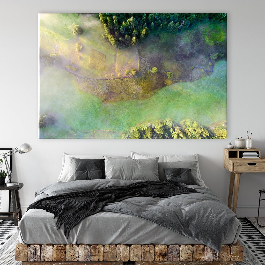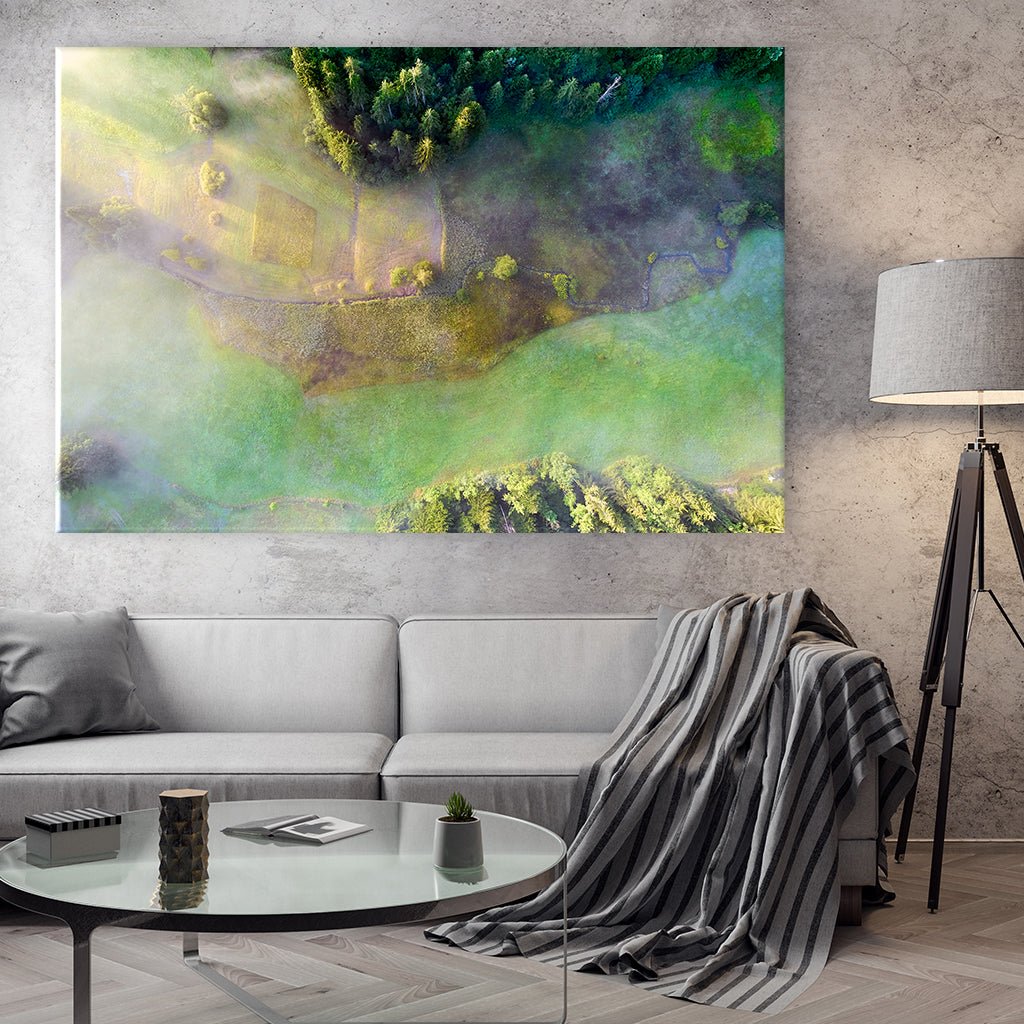 Flieg über Wälder und Flur und genieße die atemberaubende Sicht von oben. Es ist atemberaubend schön und ein tollen Blickfang für deine Bilderwand.
