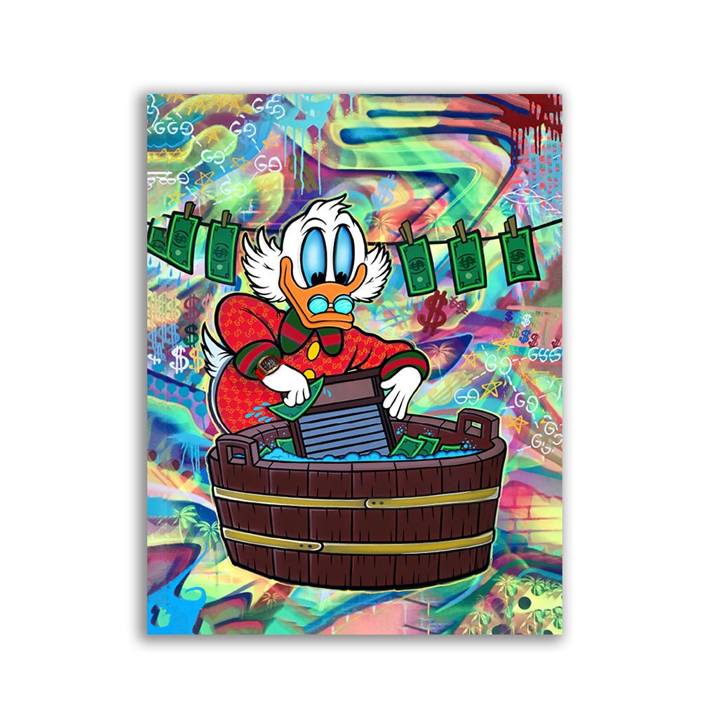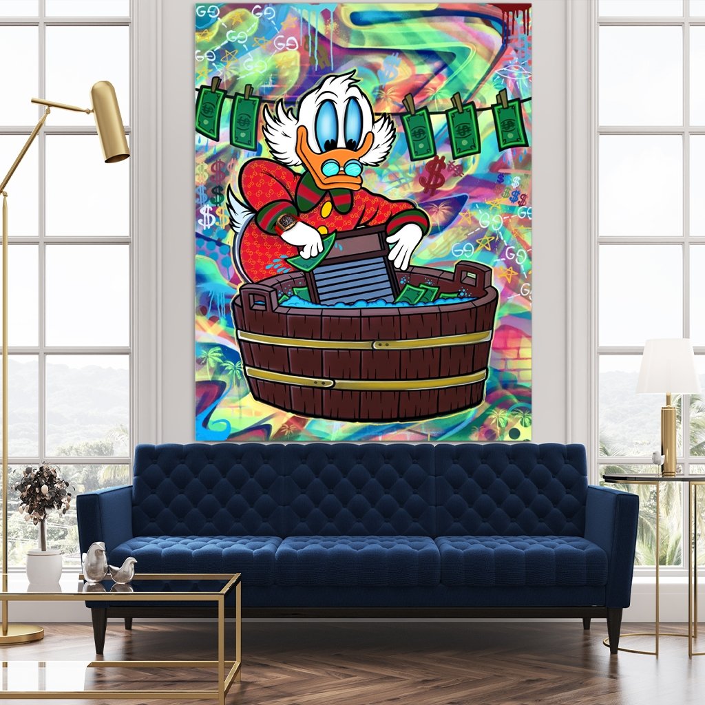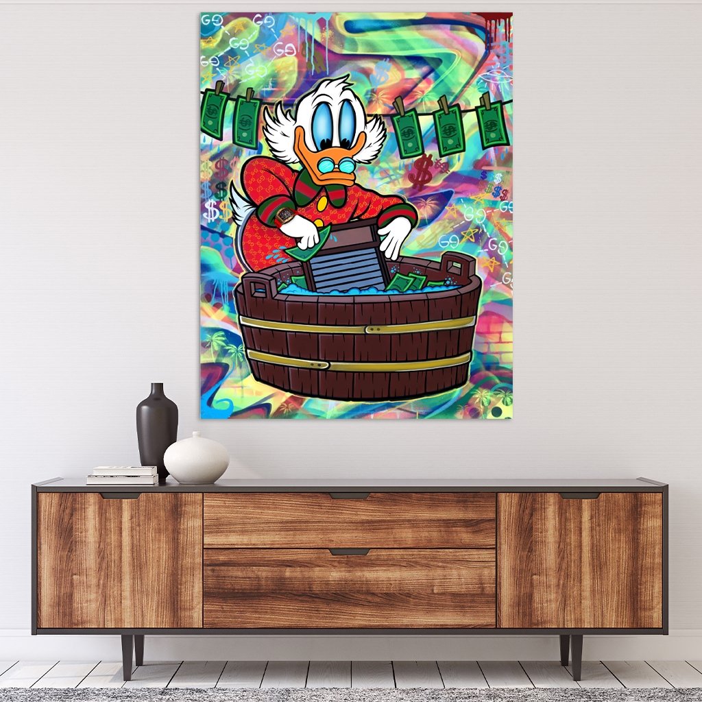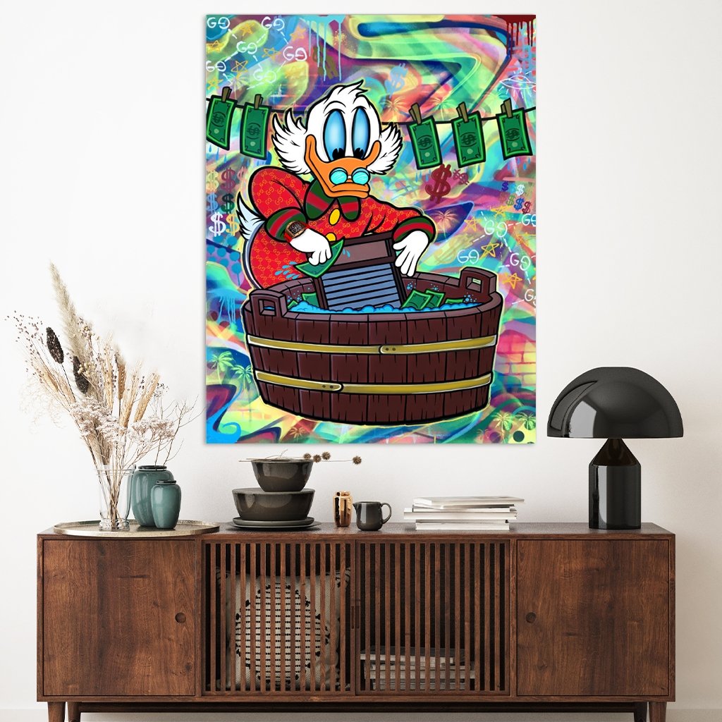 Entenhausens reichste Ente wäscht sein Geld. Man kann es nun interpretieren wie man möchte... Wäscht Onkel Dagobert Falschgeld oder ist er einfach nur sehr reinlich? Warum auch immer er dies tut es ist auf jeden Fall ein Blickfang als Leinwand oder Poster in deinem Wohnzimmer, Schlafzimmer, Flur oder deiner Loftwohnung.