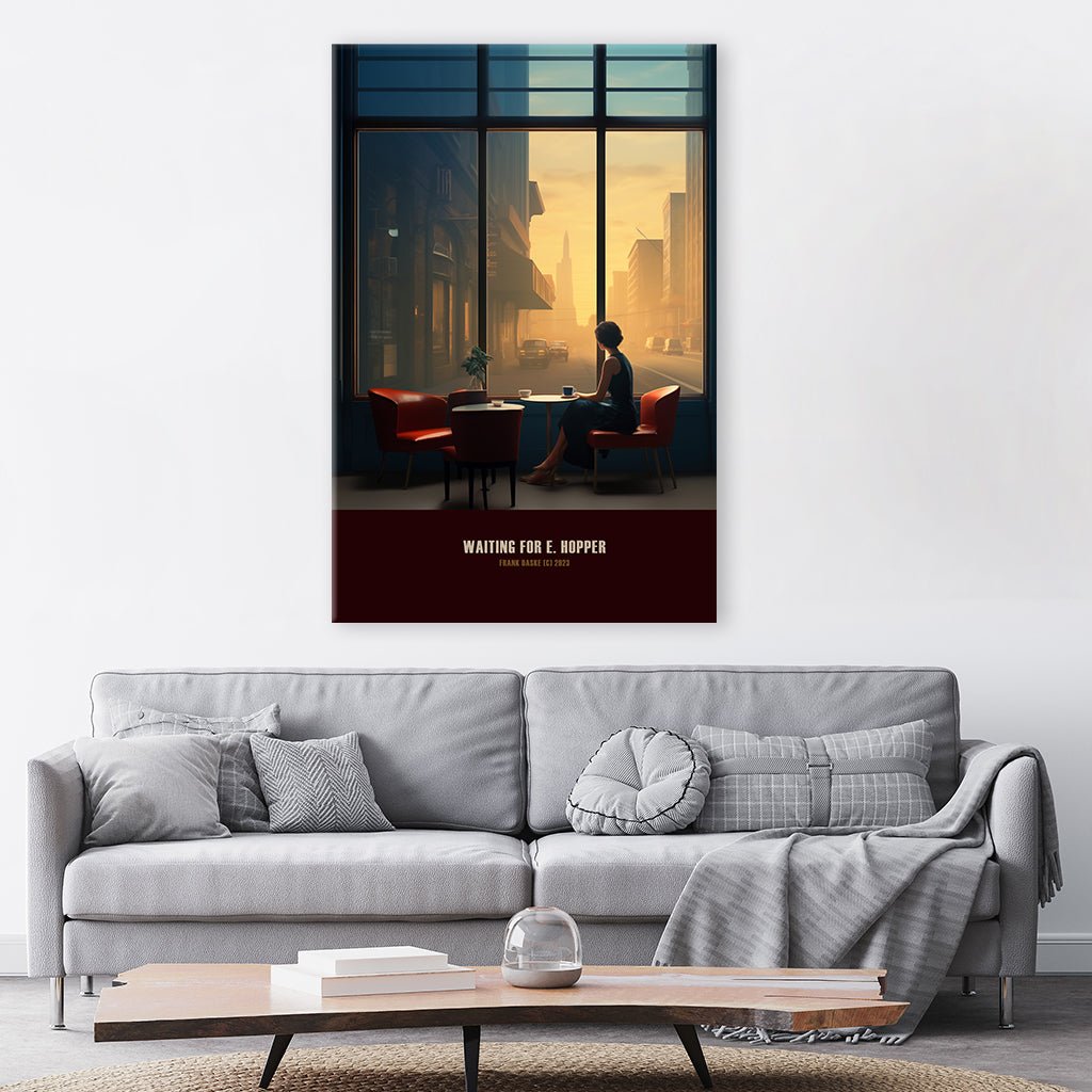 Eine Frau sitzt einsam in einer Hotel-Lobby und wartet. Sie wartet auf Edward Hopper. Wird er kommen? Wir wissen es nicht.