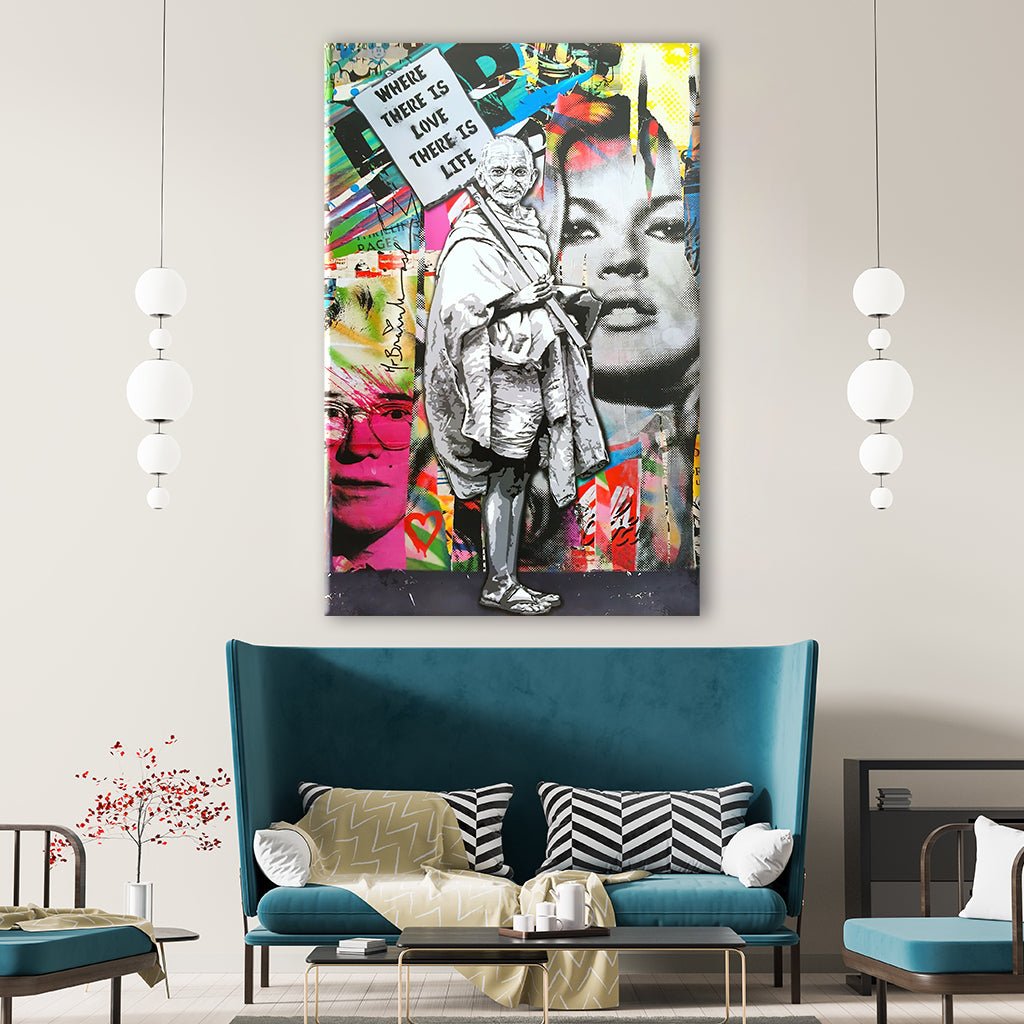 Ce motif réalisé au pochoir représente Mahatma Gandhi tenant une pancarte sur laquelle est inscrit sa célèbre phrase « Là où il y a de l'amour, il y a de la vie ». L'amour est le carburant qui nous donne la vie, ainsi que l'espoir et la force.