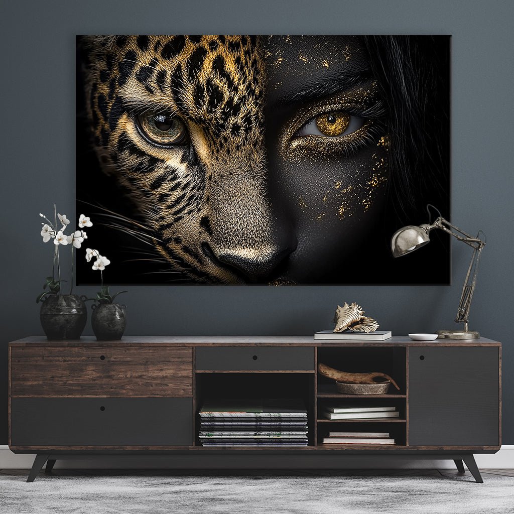 In diesem Bild verschmilzt das Portrait eines Leoparden mit der Schönheit der Weiblichkeit. Die linke Seite des Bildes zeigt das detailreiche Gesicht eines Leoparden mit seinen markanten Flecken und durchdringenden Augen. Die rechte Seite zeigt das Gesicht einer Frau in Schwarz mit goldenen Augen, die mit goldenen Glitzerakzenten auf ihrer Haut verziert ist. Die beiden Gesichter sind nahtlos miteinander verschmolzen, wodurch ein Gefühl von Harmonie und Verbindung zwischen Mensch und Natur entsteht.