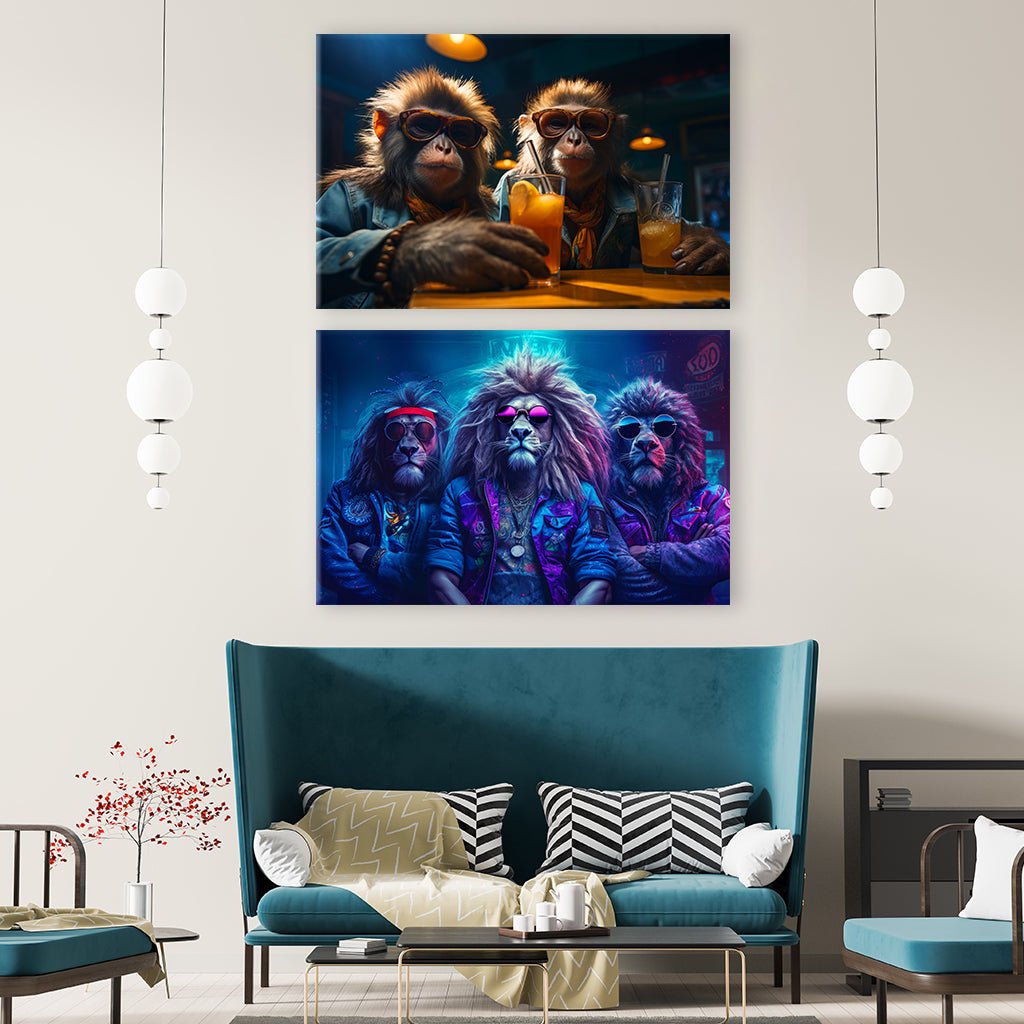 Im "Wildlife Pub" versammeln sich die wildesten Tiere für ein kühles Bier, um mit ihren Buddys abzuhängen und jede Menge Spaß zu haben. Auf den beiden Bildern dominieren die coolen Lions mit ihrem königlichen Flair und die funky Monkeys mit ihrer lässigen Attitüde. Dieser Szenario versprüht eine einzigartige Mischung aus Freiheit und geselliger Gemütlichkeit. Diese Kunstwerke werden zum Blickfang in jedem Rau.