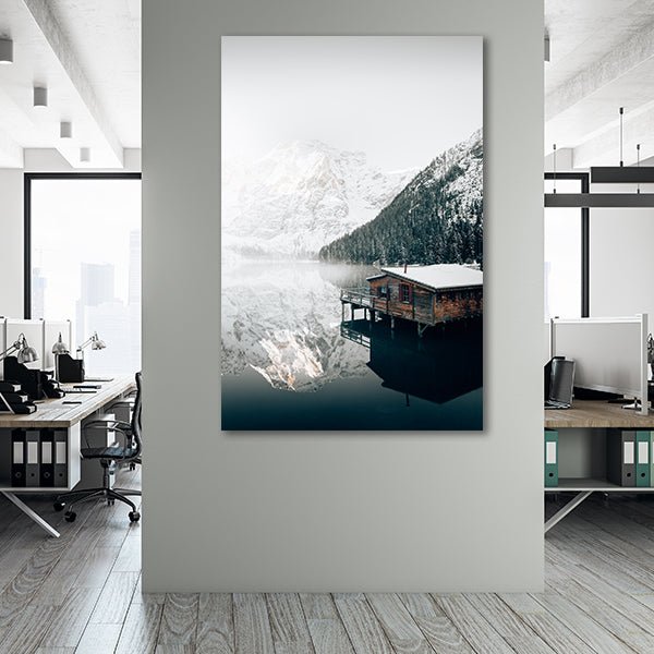 Eine einsame Bootshütte ruht malerisch an einem ruhigen See im Winter. Eingebettet in die majestätischen Alpenberge strahlt sie eine Aura von Abgeschiedenheit und Ruhe aus. Die umliegende Landschaft ist von einer weißen Decke aus Schnee bedeckt, während die klare Luft eine erfrischende Klarheit in die Szene bringt.
