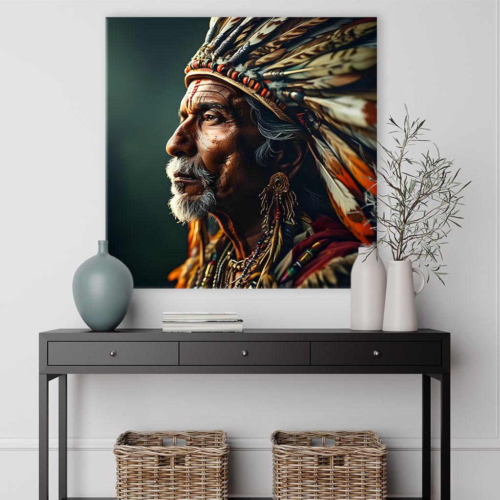 Das Bild zeigt eine Nahaufnahme eines älteren Mannes mit grauen Haaren und einem Bart. Er trägt eine traditionelle Kopfbedeckung mit Federn und Perlen, die sein Gesicht umrahmt. Er hat einen ernsten, nachdenklichen Gesichtsausdruck und blickt zur Seite. Im Hintergrund ist eine dunkle, unscharfe Umgebung zu sehen. Das Bild hat einen künstlerischen und leicht dramatischen Charakter.