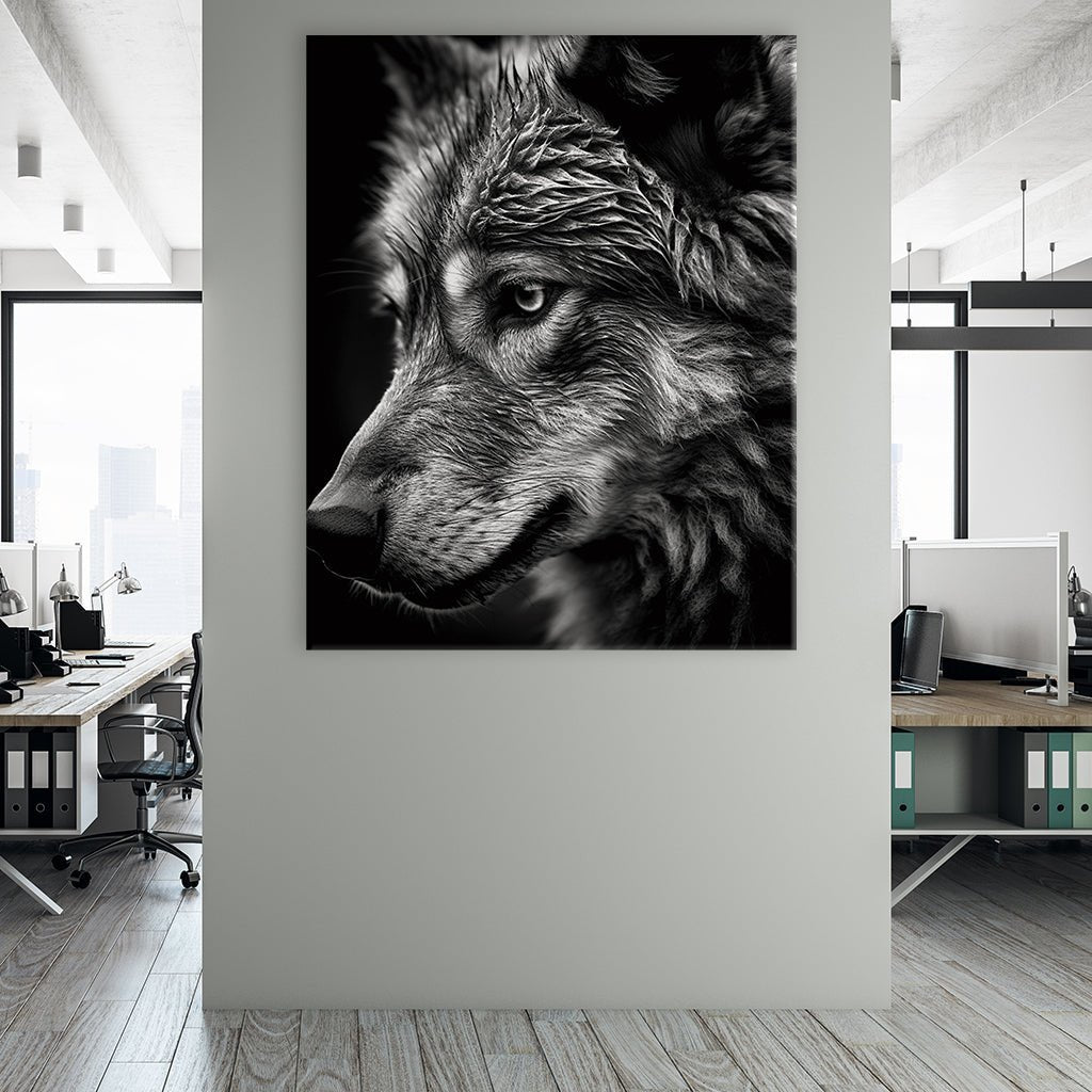 Ein eindringliches Schwarz-Weiß-Portrait zeigt einen Wolf in Nahaufnahme. Sein Blick durchdringt die Dunkelheit, voller Stärke und Intelligenz. Die Kontraste betonen die markanten Konturen seines Gesichts, während der Hintergrund in einer mysteriösen Dunkelheit verschwindet.