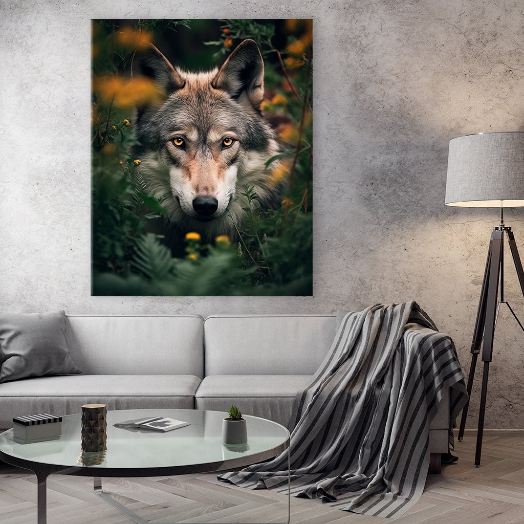Inmitten eines blühenden Blumenfeldes lugt ein majestätischer Wolf durch die Gräser. Seine intensiven Augen verfolgen jede Bewegung in der Umgebung, während er sich behutsam aus dem Dickicht hervorwagt. Ob im Wohnzimmer, Schlafzimmer oder Büro, es wird ein Blickfang sein und eine Verbindung zur wilden Natur herstellen.