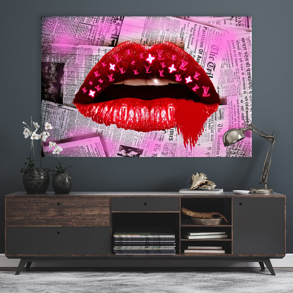 Verführerische rote Lippen geschmückt mit dem Logo der Marke Louis Vuitton. Einzelne Elemente der Logos im Neonstil gestaltet, wirkt dieser Frauenmund auf dem Hintergrund mit Zeitungen, umrandet von rosa Spray, sinnlich. Ein besonderer Blickfang für dein Schlafzimmer, Wohnzimmer, Büro oder Flur.