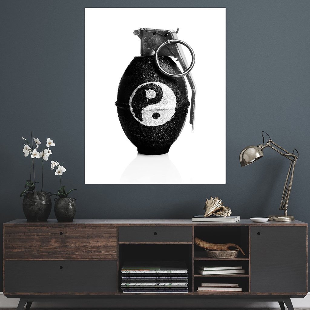 Dieses Motiv zeigt eine schwarze Handgranate mit dem YinYnag-Zeichen darauf. Ein Widerspruch der sehr aussagekräftig ist und ein besonderes Statement für deine Wände im Wohnzimmer, Schlafzimmer, Büro oder Bar.